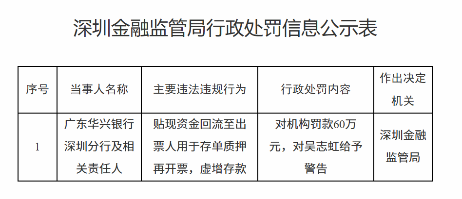 11月12日,深圳金融监管局行政处罚信息公示表显示,广东华兴银行深圳分行及相关责任人因贴现资金回流至出票人用于存单质押再开票,虚增存款被罚款60万元,吴某虹被给予警告。