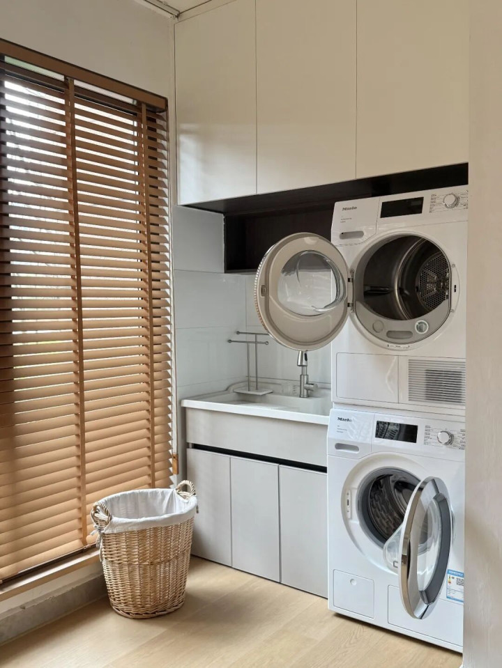 ③改成洗衣区,定制柜子嵌入洗衣机烘干机,安装洗手盆还可以收纳杂物,功能至上。