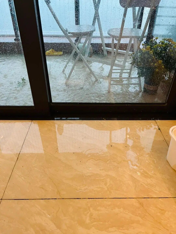 去年有天下暴雨,都不在家,雨水飘到阳台上,全渗到客厅了,等回家看到客厅全是水的时候我真想破口大骂了,这特么叫接地气?这叫接雨水接傻了吧!